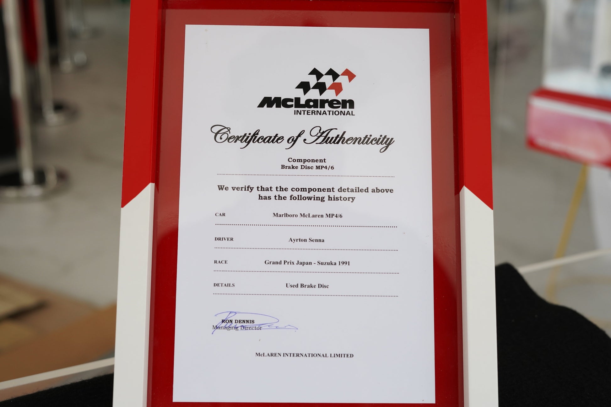 This authentic brake disc was mounted on the legendary McLaren MP4/6, the car that carried Ayrton Senna to his third and final Formula 1 World Championship. The disc was used during the 1991 Japanese Grand Prix at Suzuka, where Senna famously secured the title.