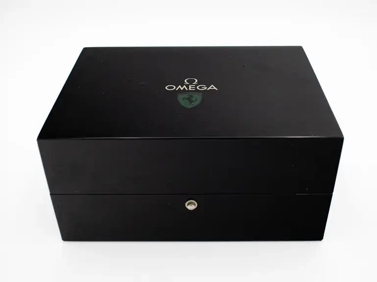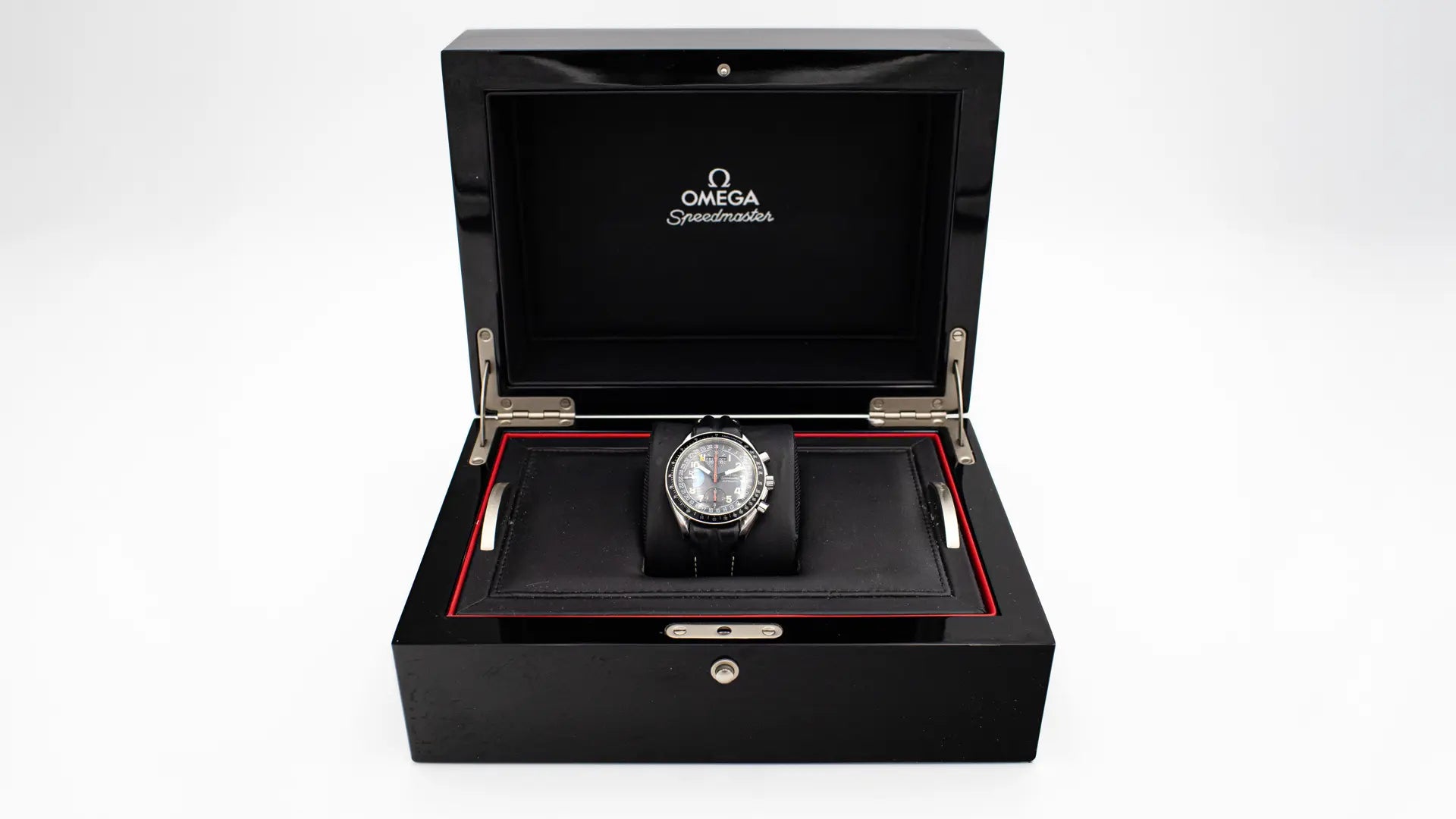 Housed in its original lacquered black Omega Speedmaster box with red interior detailing, this chronograph remains a coveted collector’s piece connecting horological mastery with motorsport heritage.