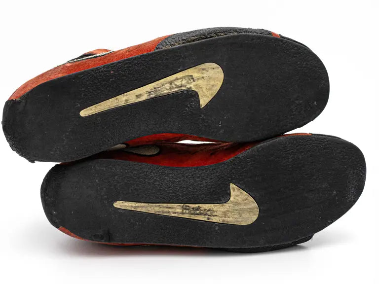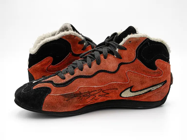 These striking mid-top boots feature Schumacher’s iconic red-and-black flame design with embroidered Nike swooshes and soft FIA-approved fleece lining for heat protection. The soles bear signs of authentic race use, while both outer panels are autographed by Schumacher in black marker. Inside, FIA compliance labels read “ISO 6940 – Complies with FIA 1986 Standards”, confirming their professional race specification.