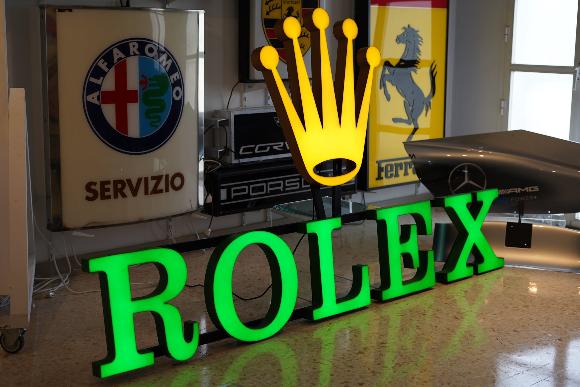 This rare, large, original factory green metal and plastic sign is an exceptional piece of Rolex history, measuring an impressive 255 x 140 x 18 cm (100" x 55"). Originally crafted for an authorized Italian Rolex dealer in Milan, it was prominently displayed during the 2000s and 2010s.