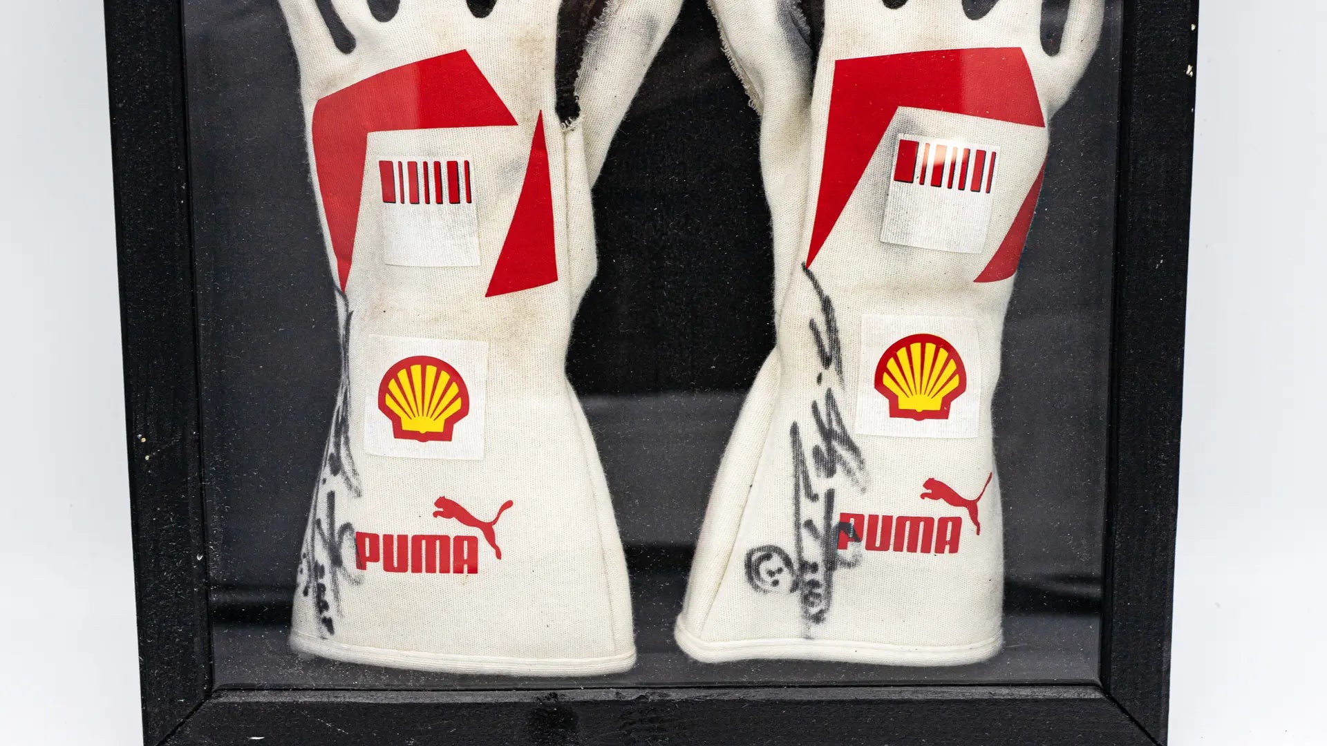 Featuring the unmistakable Ferrari red and Shell sponsorship logos, along with the Puma insignia, each glove bears Schumacher’s bold black ink signature. Presented in a custom black shadow box with a brushed metal identification plaque, this display piece captures the essence of Ferrari’s golden era and Schumacher’s unmatched legacy.