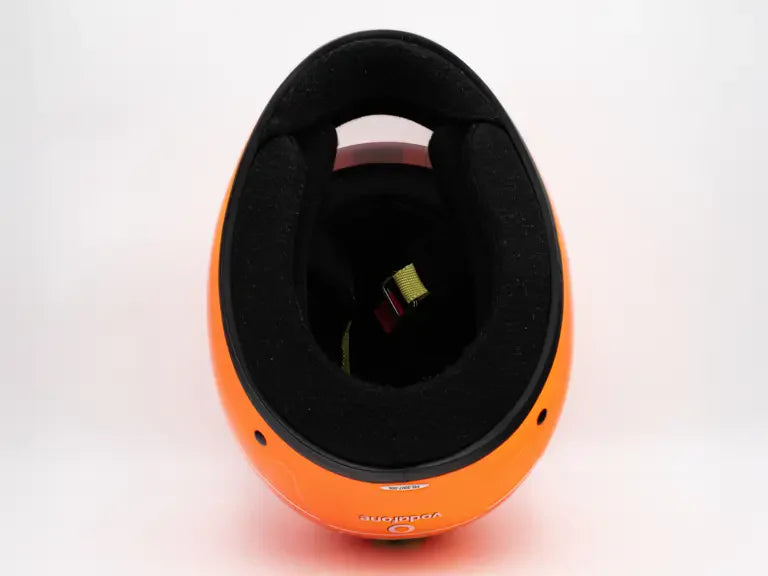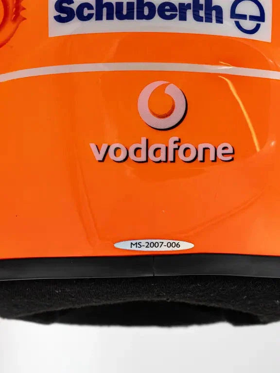 Finished in Schumacher’s unmistakable gloss orange and white Ferrari livery, the helmet displays sponsorship decals from Vodafone, AMD, Ferrari, and Schuberth, reflecting the same aesthetic worn during his final Scuderia Ferrari seasons. The helmet bears the factory serial number MS-2007.006, designating it as one of Schumacher’s authentic Schuberth-manufactured personal units.
