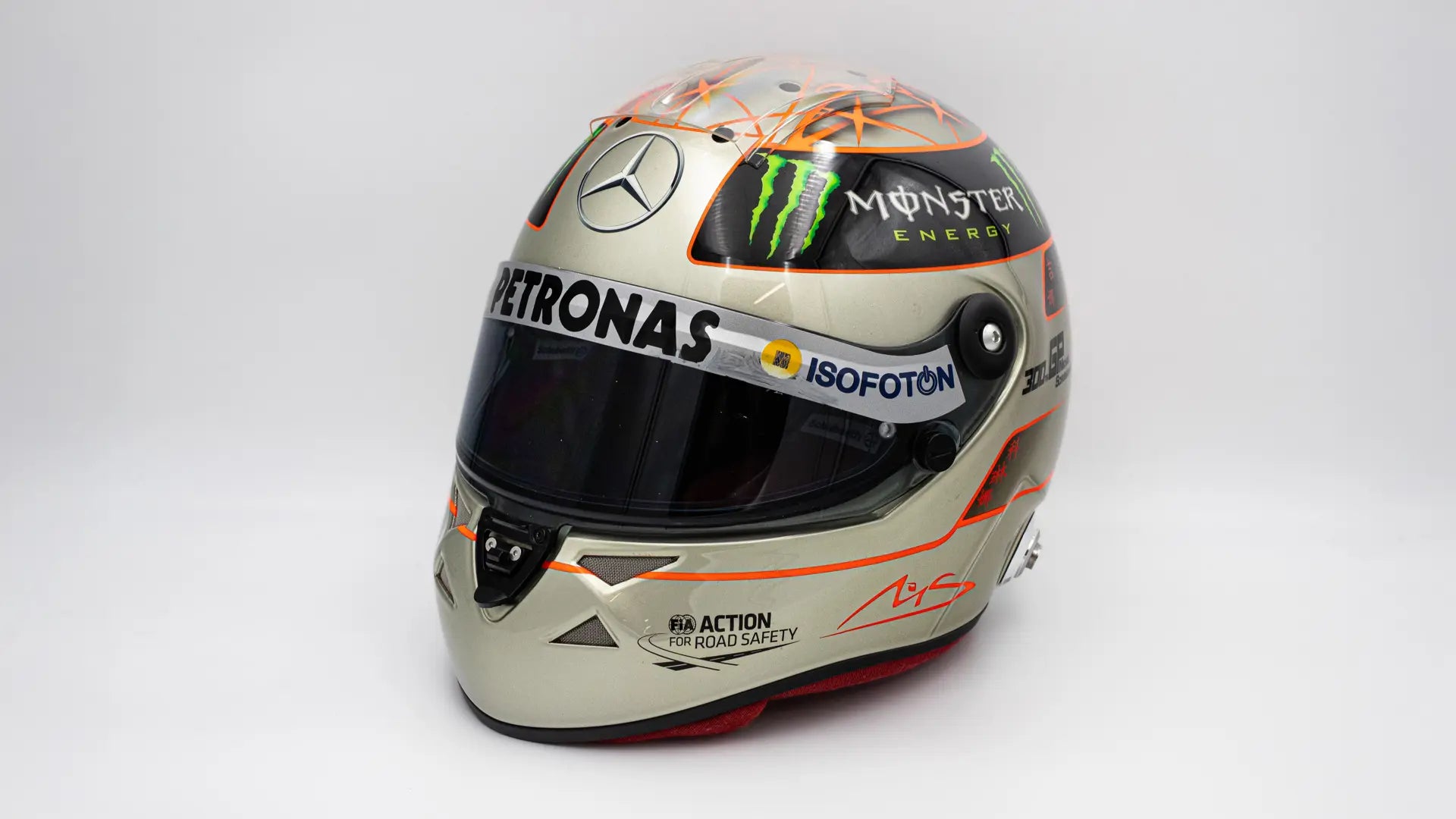 A stunning Schuberth replica helmet meticulously crafted by Jens Munser Designs, the original creator of Schumacher’s official race helmets, commemorating the seven-time World Champion’s 300th Grand Prix milestone.